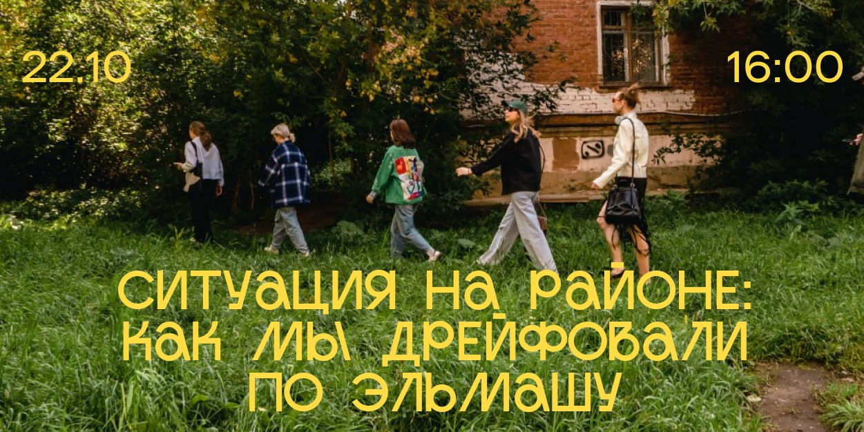 И уже скоро мы подведем итоги наших встреч. 22 октября в 16:00 пройдет перформанс «Ситуация на районе: как мы дрейфовали по Эльмашу» в Пространстве Заря (Баумана, 2).